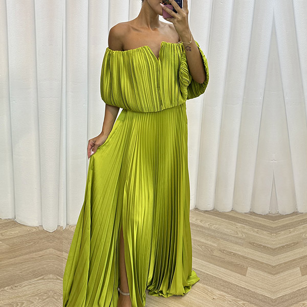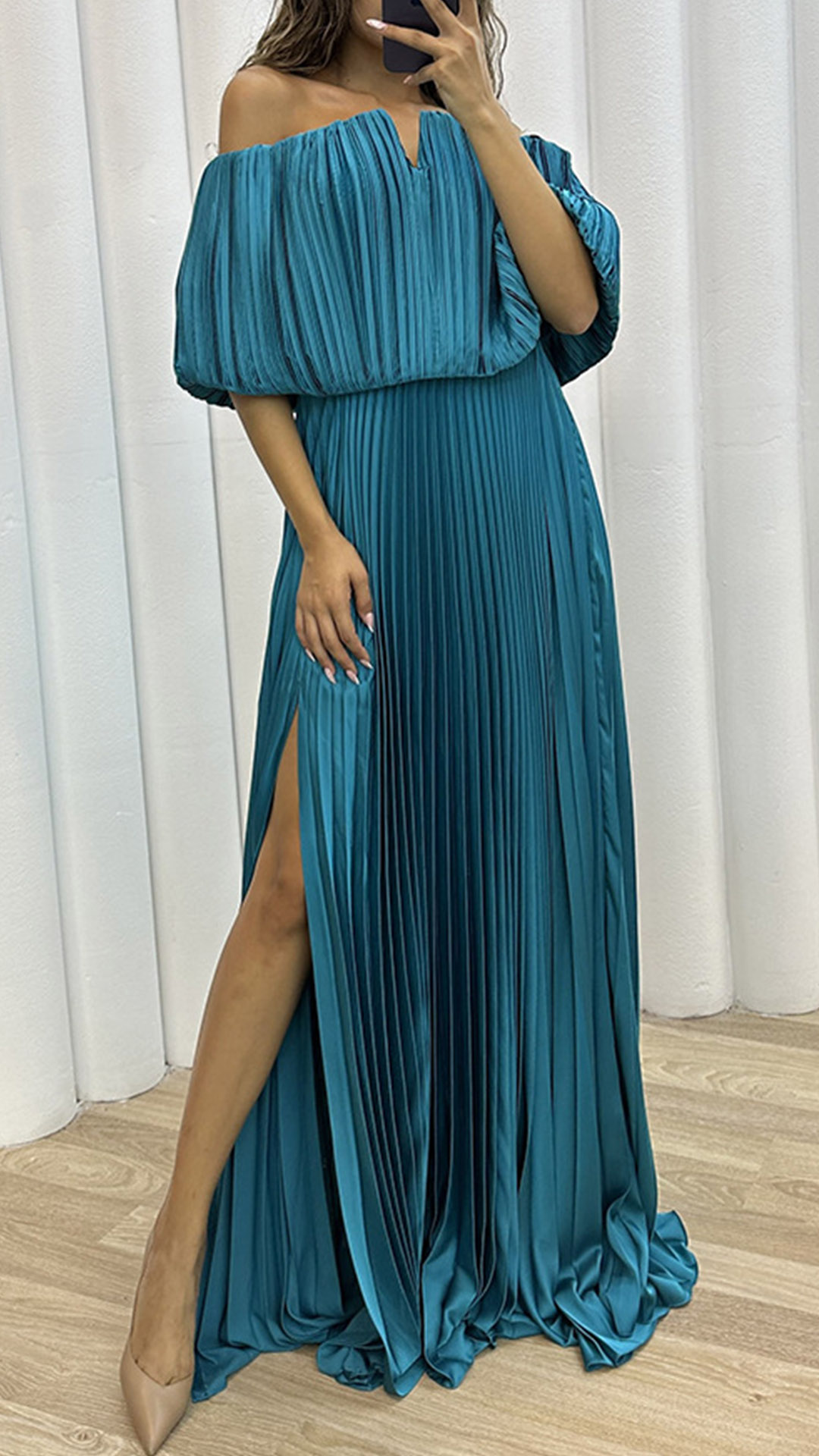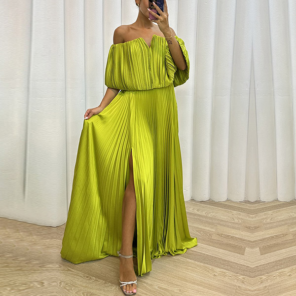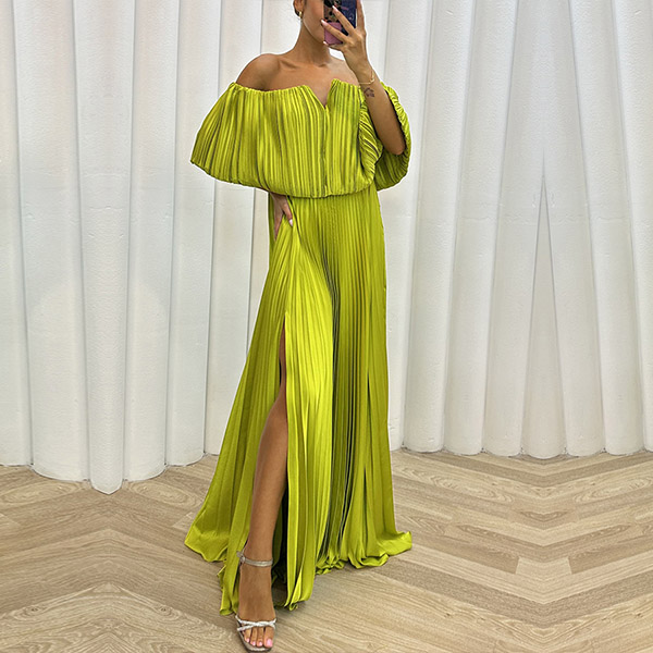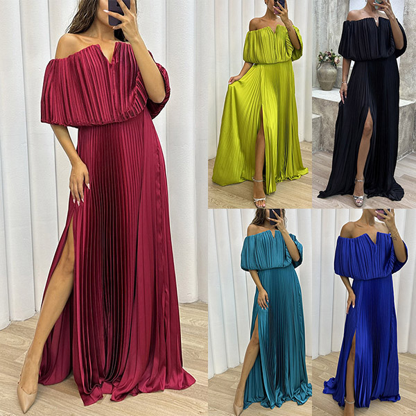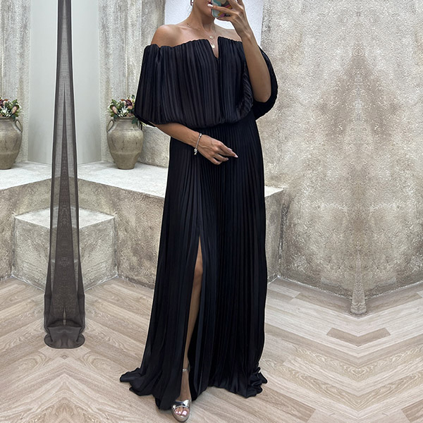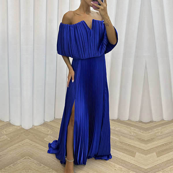 This Party Dress features an alluring off-the-shoulder neckline, a thigh-high slit, pleated detailing, and a sweeping maxi length, creating a captivating and glamorous look. This dress is perfect for cocktail parties, formal events, or any occasion where you want to exude confidence and allure.