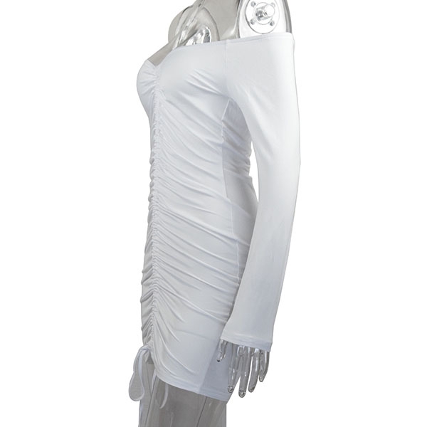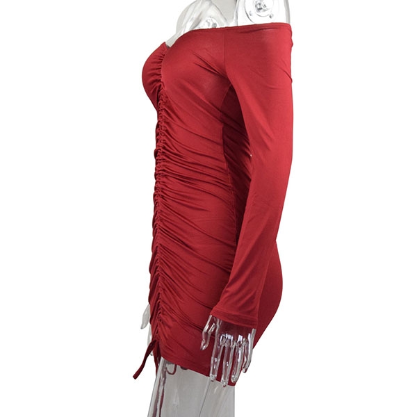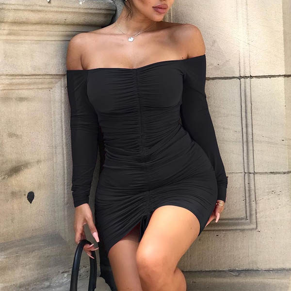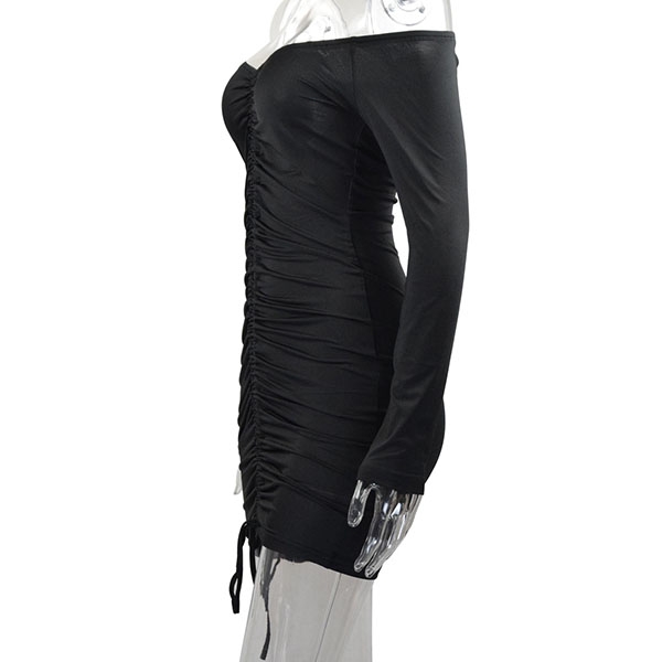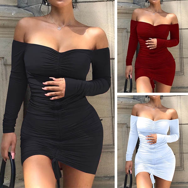 Render in a slim fit silhouette, feature off-the-shoulder neckline, ruched construction with a drawstring