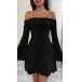 This black dress features off-the-shoulder neckline exudes a sense of sophistication and sexiness, making it a standout feature of the dress. The trumpet sleeves add a touch of drama and movement, creating a dynamic and eye-catching look. It is perfect for a night out or special occasion.