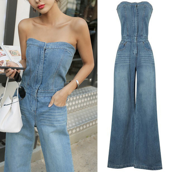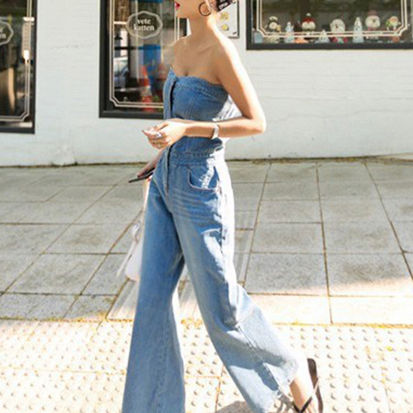 This jumpsuti features old-washed denim design, strapless neckline, and wide-leg silhouette for a sexy and stylish look. Pair it with sneakers and a leather jacket for a cool and casual outfit.