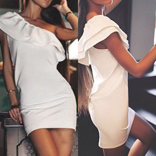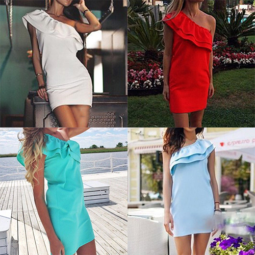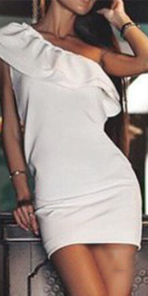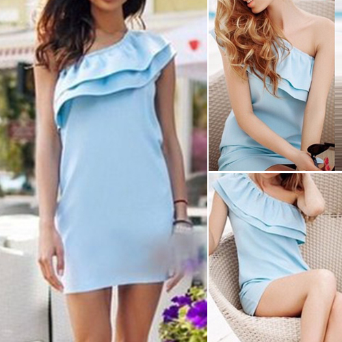 on this one. One-shoulder style,with an elegant solid color,sweet flouncing and a fit silhouette,