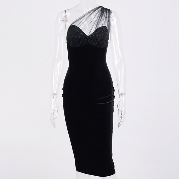 Like the saying goes, if you have it why not flaunt it? Seductive appeal comes easy once you slip into this breathtaking dress. The one-shoulder and gauze spliced design make this piece look so sexy and alluring. Comes with a classic yet flattering black tone,with a fit silhouette,this dress also can showcase your slender figure. So why not save this piece for your fancy events?