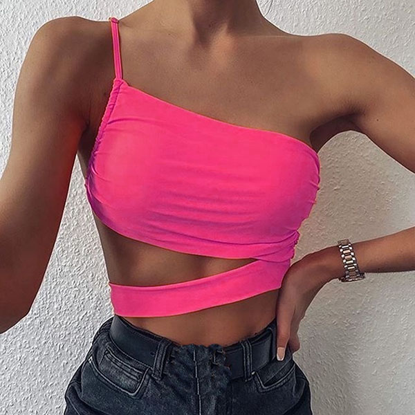 You can look sexy and flirty enough when you wear this sling crop top. One-shoulder and hollow out hem design make this piece look so alluring. This piece not only can expose your charming skin,but also can express your style and charm. Perfect fit for matching with high waist shorts or skirts.