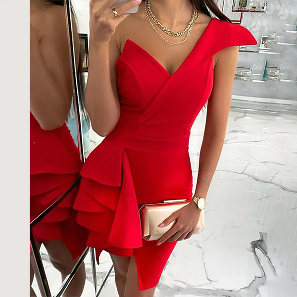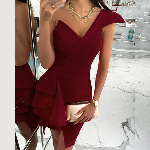 Sexy One-shoulder Ruffle Hem Solid Color Slim Fit Party Dress