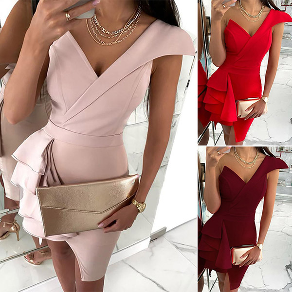 When stepping into a party,this dress can easily make you be the most stunning party queen! One-shoulder,v-neck and ruffle design make this piece look so sweet,alluring and stunning. Solid color style,the high waist and fit silhouette design also can showcase your slender figure. If paired with your sexy heel,elegant clutch and sparkle necklace,you would be more charming!