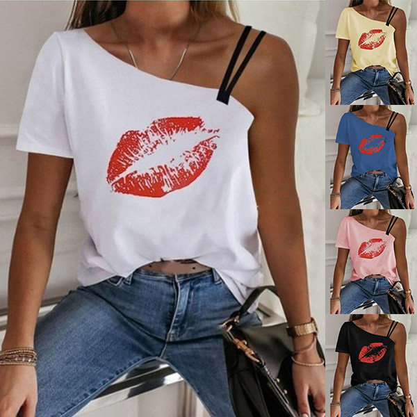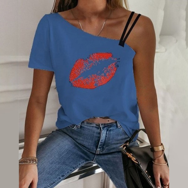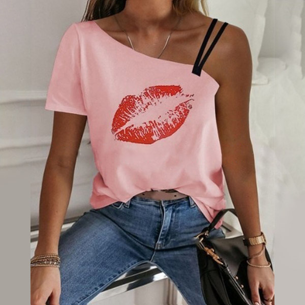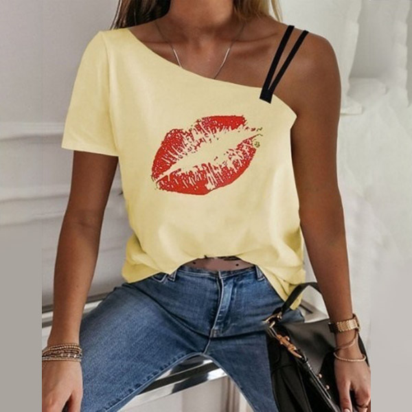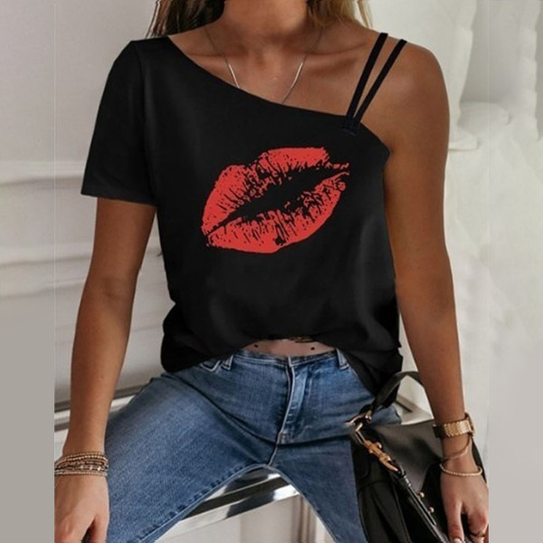 You can easily gain more eyes when you wear this t-shirt. One-shoulder and red-lip printed pattern design make this piece look so distinctive and alluring. Meanwhile,you can trust in this piece to give you a comfortable day thanks to its soft and breathable fabric.