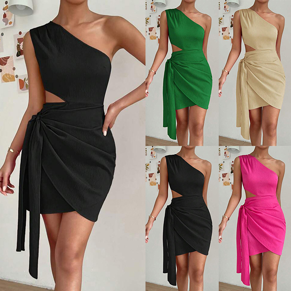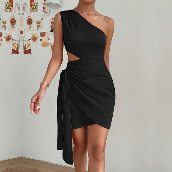 This is a wrap dress! It features a one-shoulder design, side cutouts, and a bodycon silhouette for a stunning and sexy look.