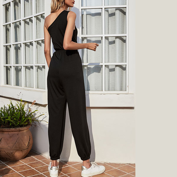 Thanks to the high waist and flattering black tone,your slender figure can have a full display in this jumpsuit. One-shoulder design can lend you a dash of sexy and flirty vibes. Crafted from soft and breathable fabric,with sleeveless design,this piece is a good weapon to express your beauty and charm.