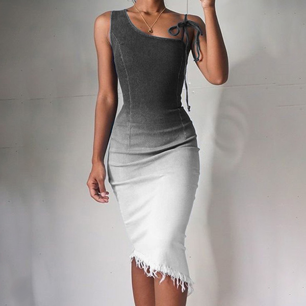 Sexy One-shoulder Sleeveless Irregular Tassel Hem Color Gradien Party Dress