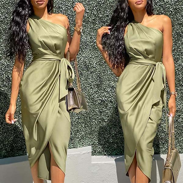 Sexy One-shoulder Sleeveless Slit Hem Solid Color Dress