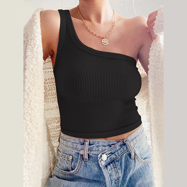 Wanna try a different style top? Then you can just make your eyes focused on this piece! One-shoulder design will offer you a more alluring look. Solid color style,with sleeveless and a fit silhouette,this piece not only can showcase your perfect body-line,but also can help you catch more eyes. We will suggest you matching with a high waist shorts to enjoy your summer days.
