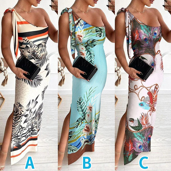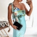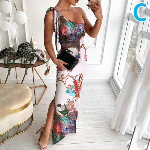 Sexy One-shoulder Slit Hem Sleeveless Slim Fit Printed Party Dress