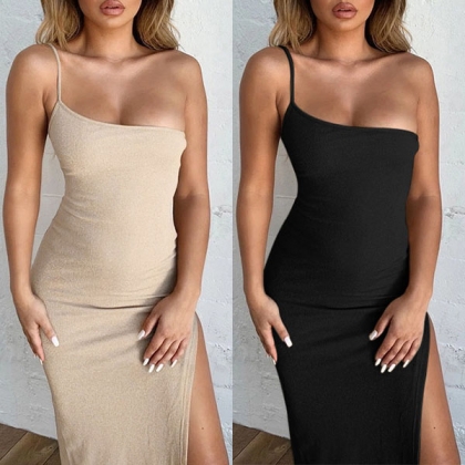 Sexy One-shoulder Slit Hem Slim Fit Sling Dress