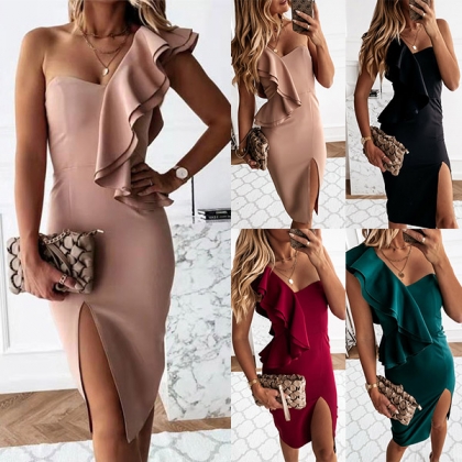 Sexy One-shoulder Slit Hem Solid Color Slim Fit Ruffle Party Dress