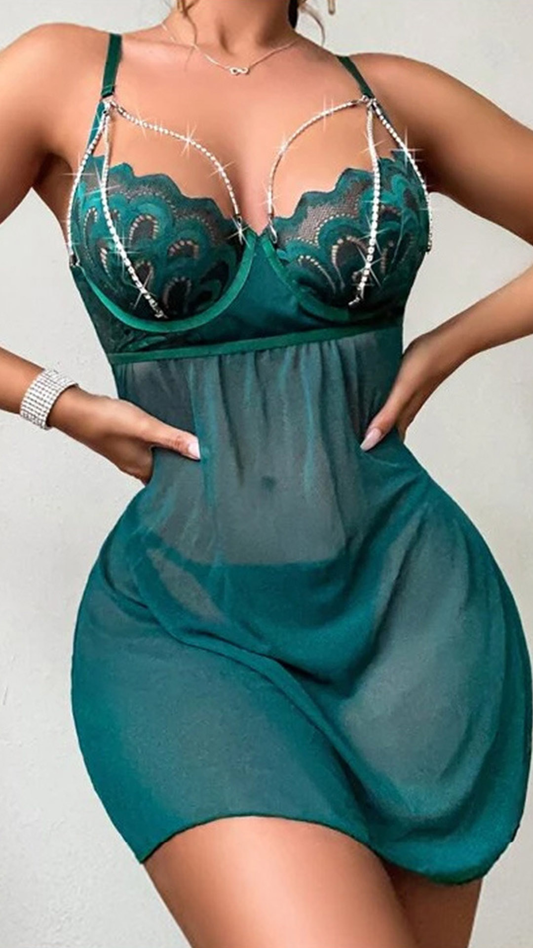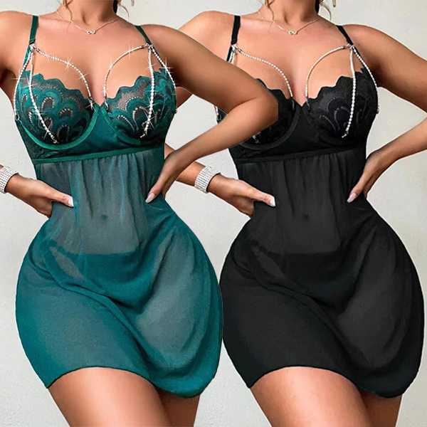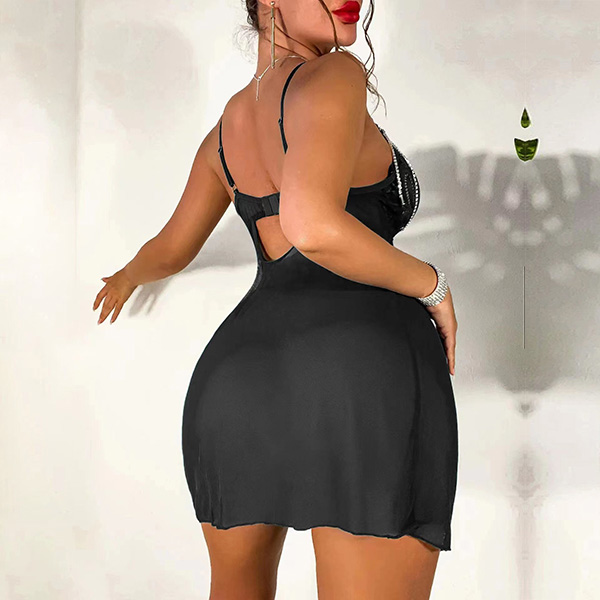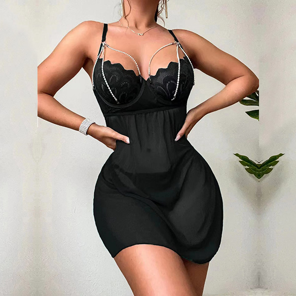 Sexy Pearl Lace Spliced Semi-through Gauze Slip Nightwear Dress
