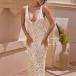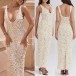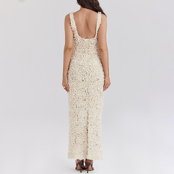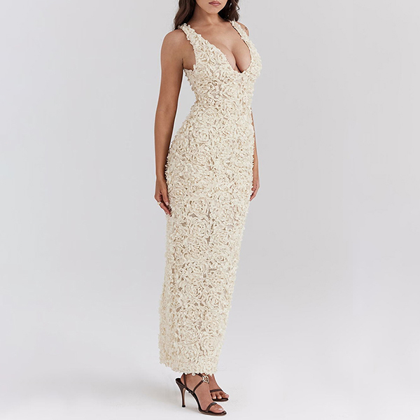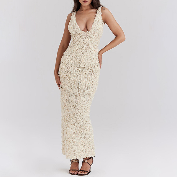 This sexy bodycon dress features a plunging V-neckline, sleeveless design, backless style, and 3D floral detailing, creating a bold and alluring look. It is ideal for making a statement and turning heads at a special event or night out.