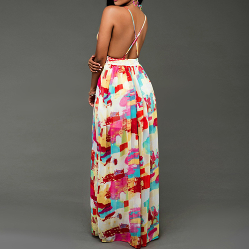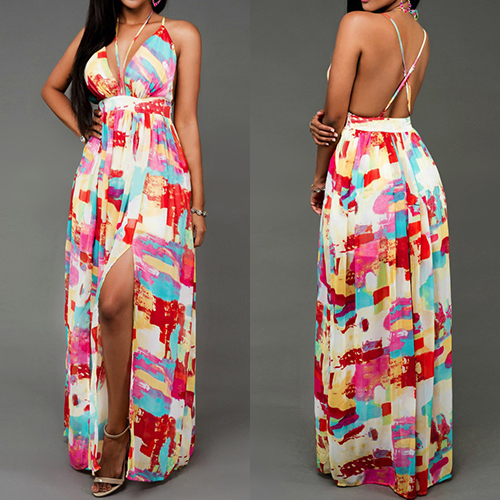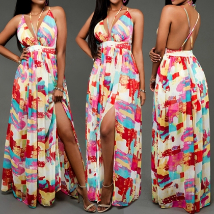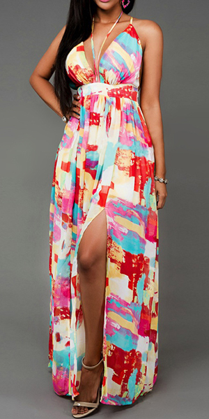 chic printed design, stylish and eye-catching. Sleeveless, halter and slit hem design can show your