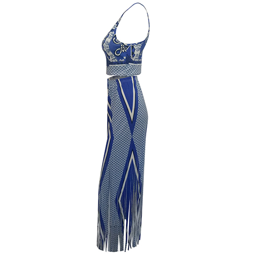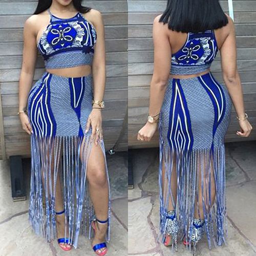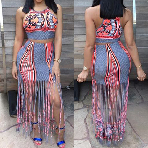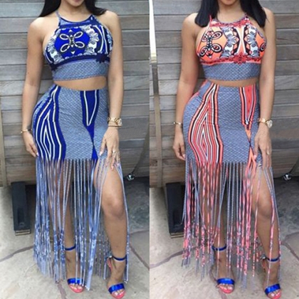 Features chic printed pattern,including a cami top and a high waist tassel hem skirt,this two-piece set allows you