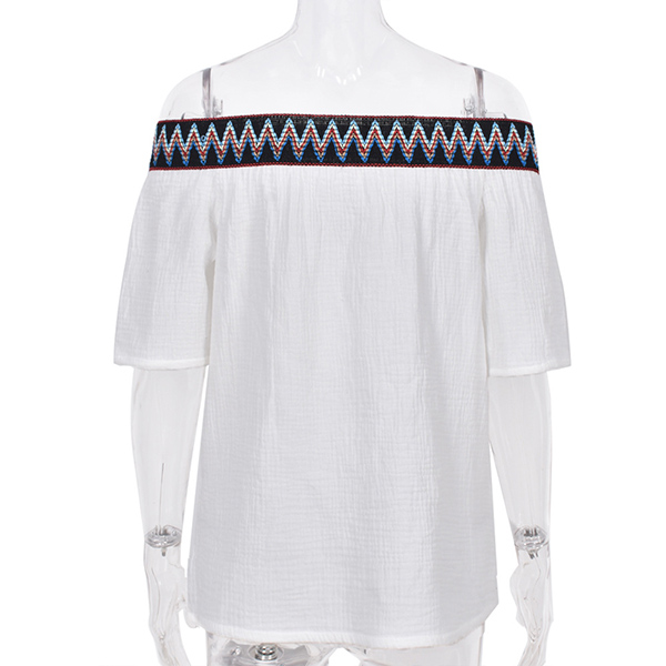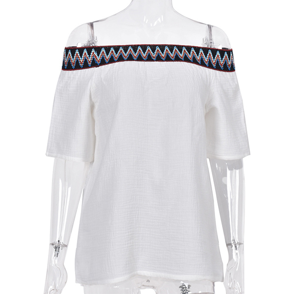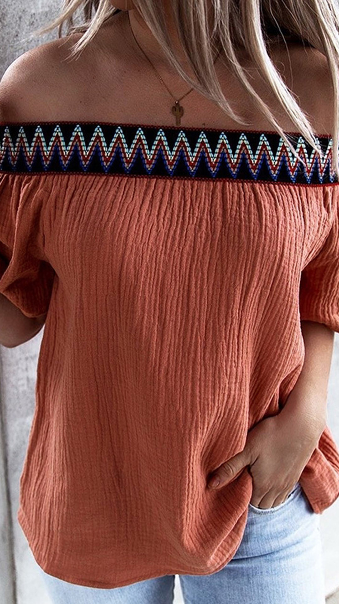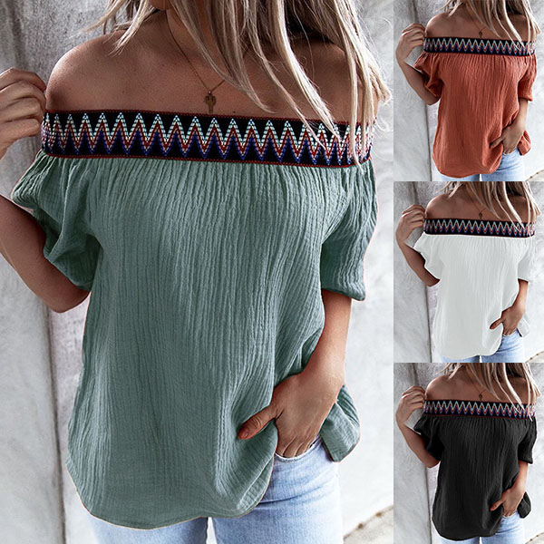 What makes this piece look so stylish and attractive? It owes to the printed spliced boat neck design. Meanwhile,its soft fabric and loose silhouette design can give you a comfortable day. You can just slip into this wonderful top to showcase your charming shoulder as well as exude your charming feminine appeal. At this time,you can match with a choker necklace to make yourself look more beautiful.
