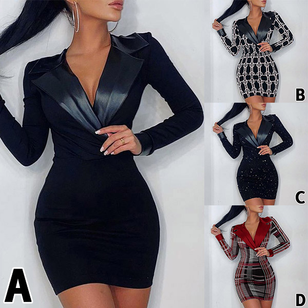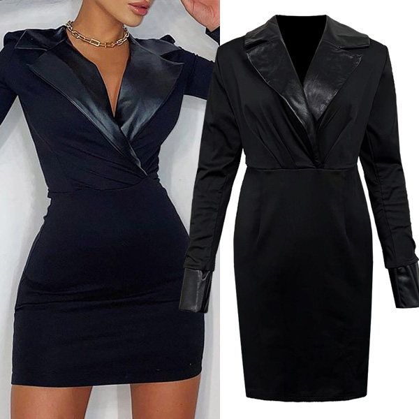 Hey,girls,you are sure to be the focus when you don this dress. The PU leather spliced lapel and chic printed details make this piece look so eye-catching and attractive.while the high waist and fit silhouette design can better showcase your slender figure. It is perfect fit for your fancy events.