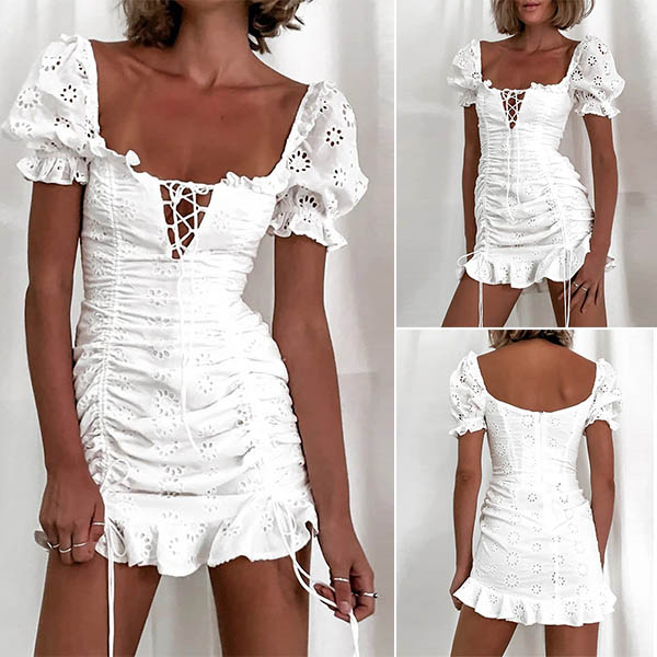 There is no wonder that you can be the focus when you don this dress no matter when and where you are. Its alluring design details like puff sleeve,square collar and ruffle hem design make this piece full of sexy,flirty vibes. The lace-up design will further enhance its charm. For some special occasions,this dress is a wise choice.