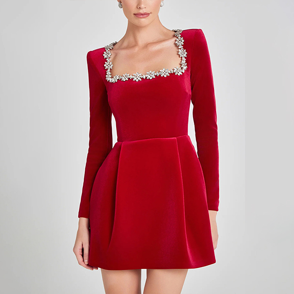 This mini dress features a square neckline adorned with rhinestone floral decorations that add a touch of sparkle and elegance, creating a luxurious and eye-catching look. The side pockets add a practical and casual element to the dress. Perfect for daily or party wear~