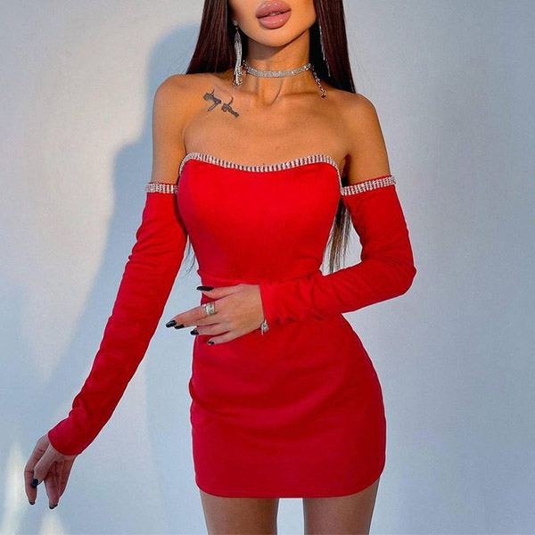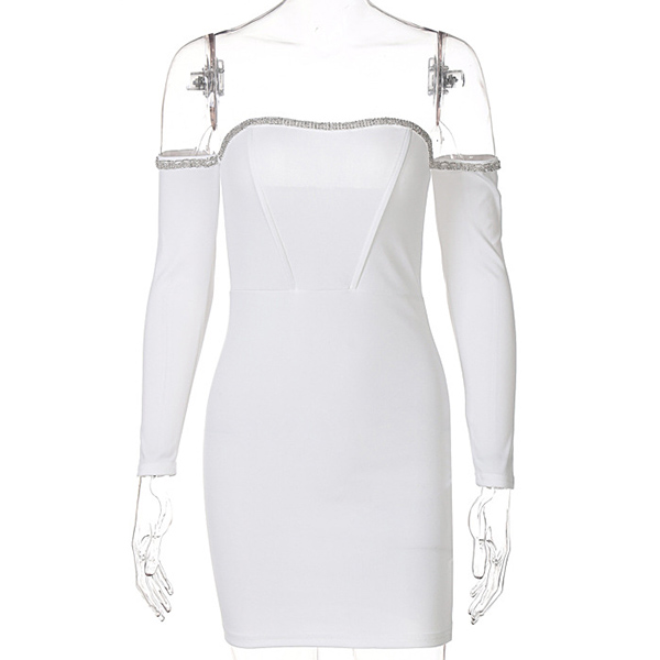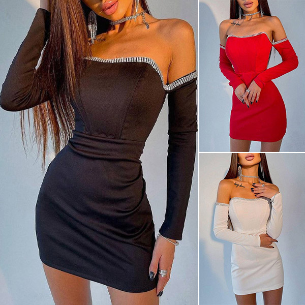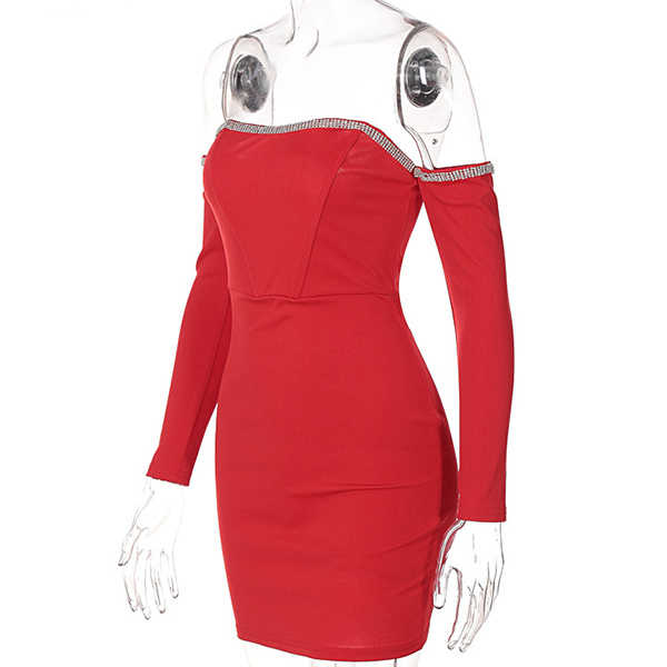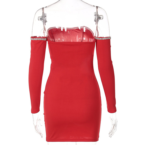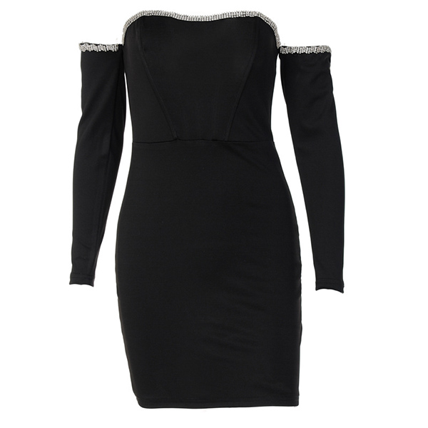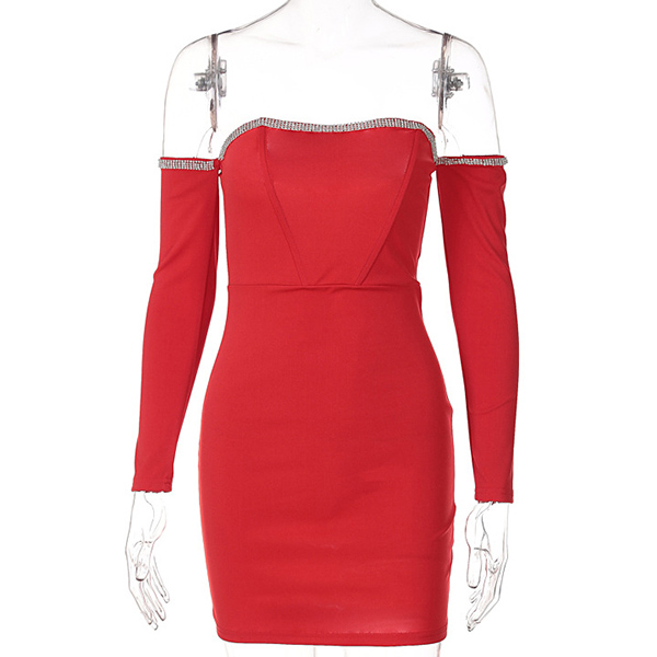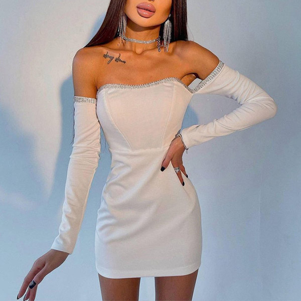 Sexy Rhinestone Inlaid Off-shoulder Boat Neck Long Sleeve Slim Fit Party Dress