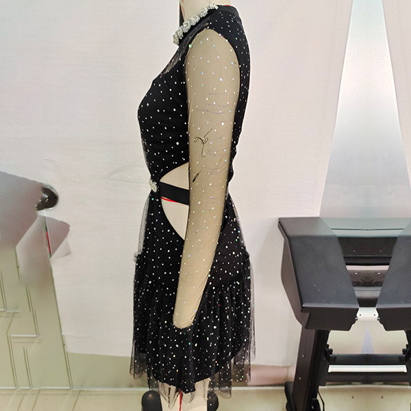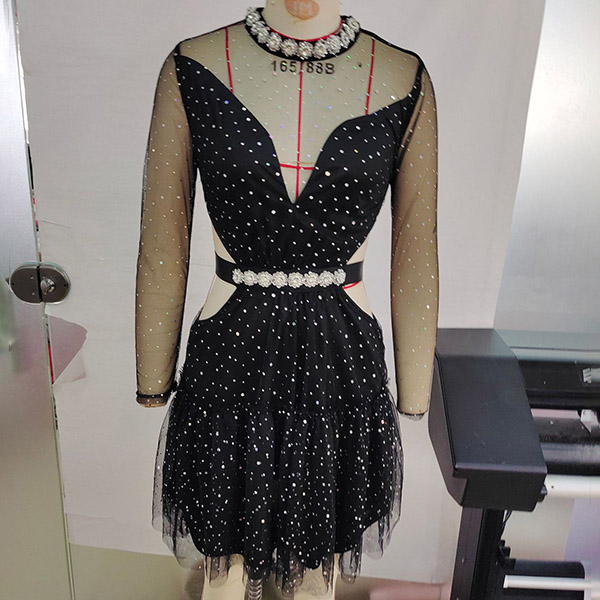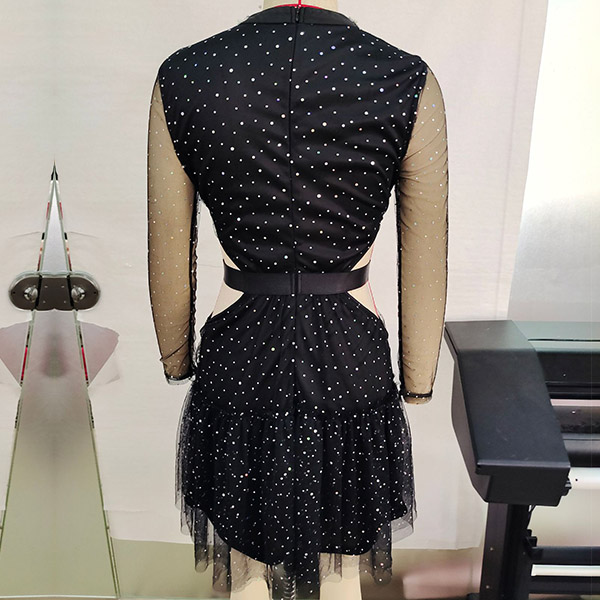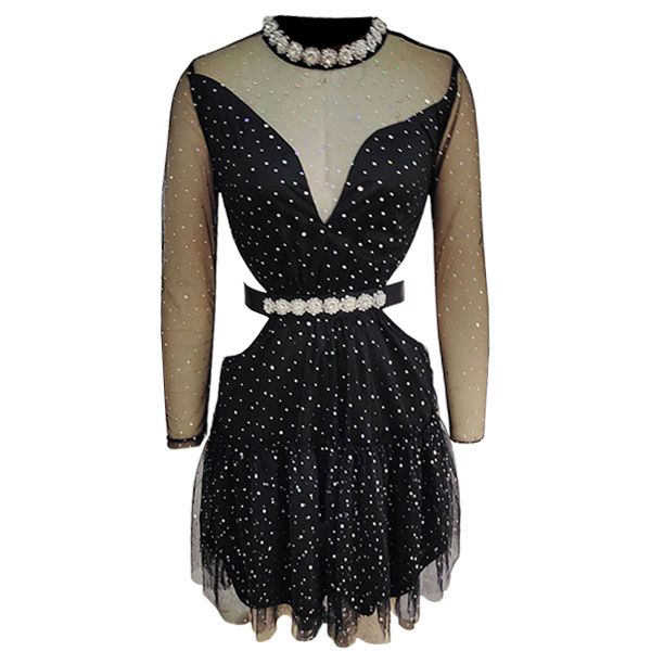Sexy Rhinestone Semi-through Gauze Spliced Mock Neck Long Sleeve Side Cutout Tutu Dress