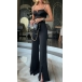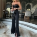 Black jumpsuit featuring narrow rhinestone shoulder strap, wide-leg with slit details and a sexy V-neck, it would perfect for both formal occasion or daily wear.