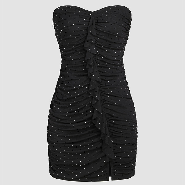 This dress features a strapless bodice with a sparkling rhinestone design that adds a touch of luxury and elegance. Ruched design with front ruffled decoration creates a playful and feminine touch, making this dress perfect for dancing and movement.