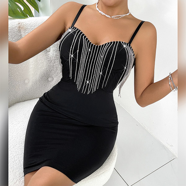 Crafted from high-quality materials, this cami dress ensures both style and comfort. It features sweetheart neckline, bodycon silhouette, and rhinestone tassel embellishments for a stunning and seductive look.