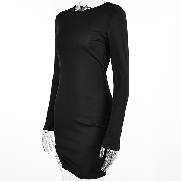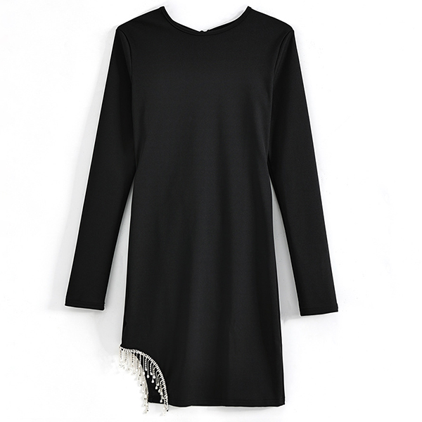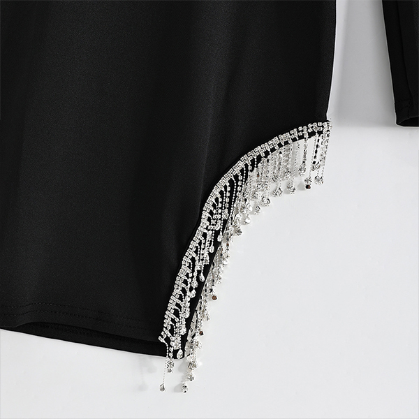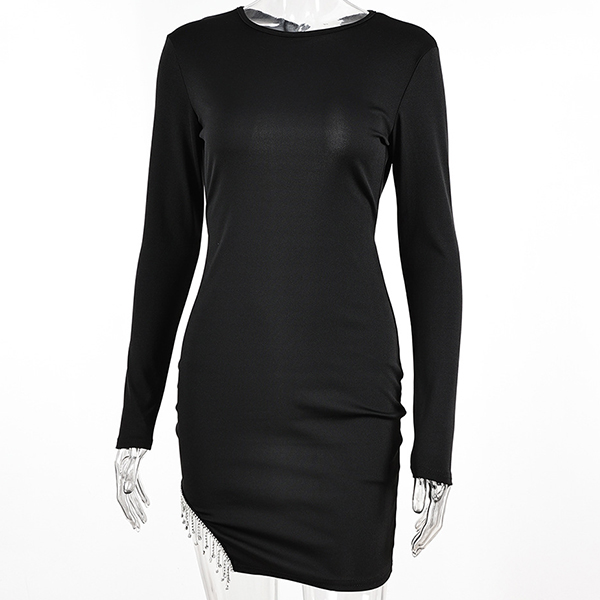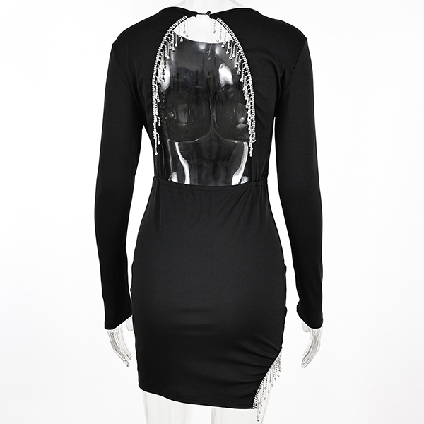 Sexy Round Neck Long Sleeve Rhinestone Tassel Backless Irregular Hemline Bodycon Party Dress