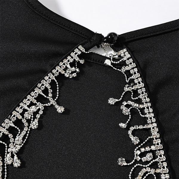 This is a glamorous and eye-catching party dress that combines a round neckline, long sleeves, rhinestone and tassel embellishments, a backless design, and an irregular hemline for a sexy and fashionable look. The rhinestone and tassel embellishments add a touch of sparkle and movement to the dress, creating a dazzling and attention-grabbing effect. Hope you like it.