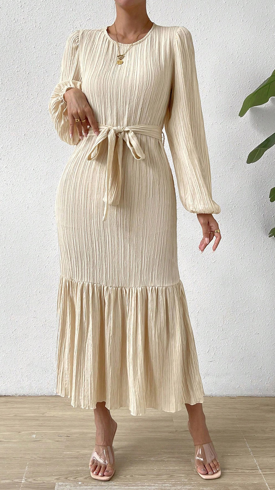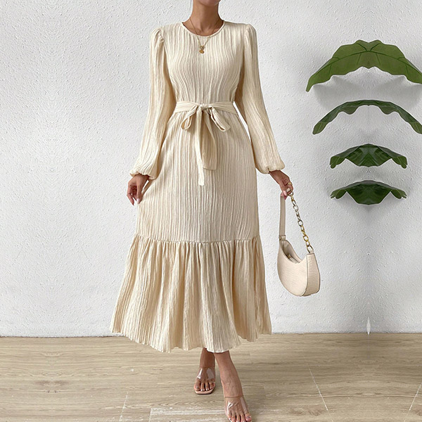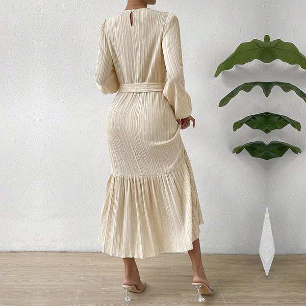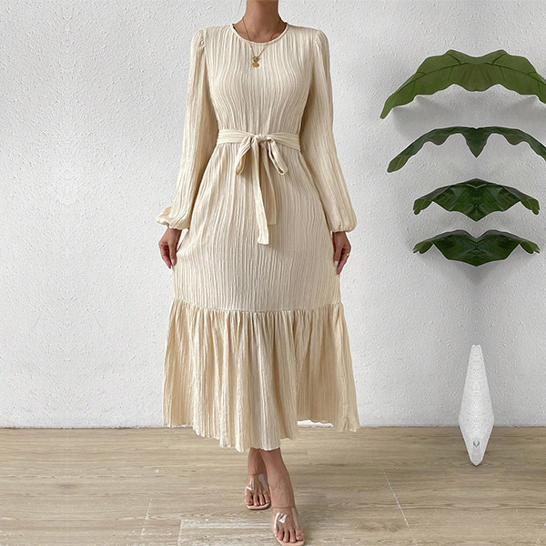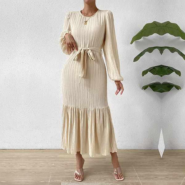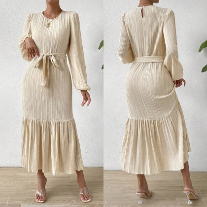 Sexy Round Neck Long Sleeve Self-tie Ruffled Hemline Midi Dress