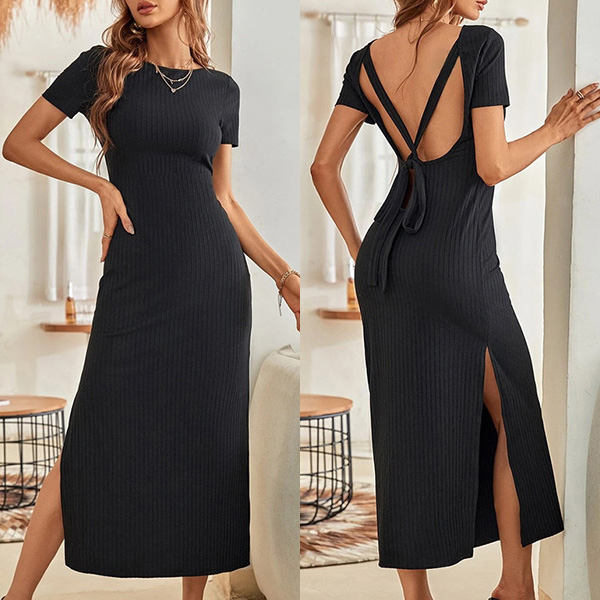 This black dress features a round neckline, short sleeves, self-tie backless detailing, and a daring slit for a seductive and stylish look.