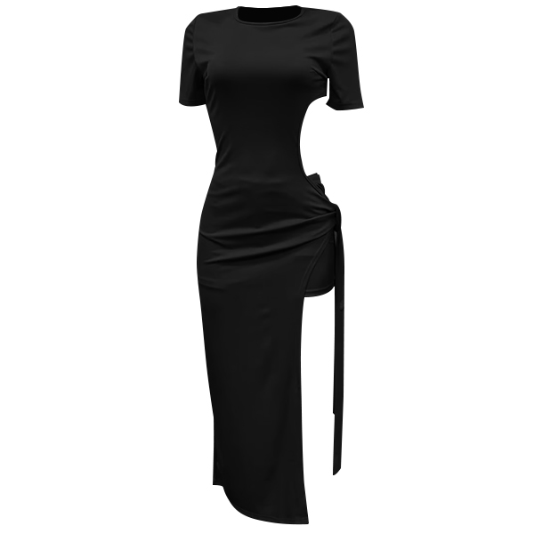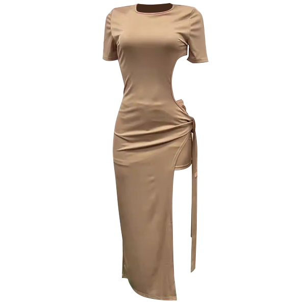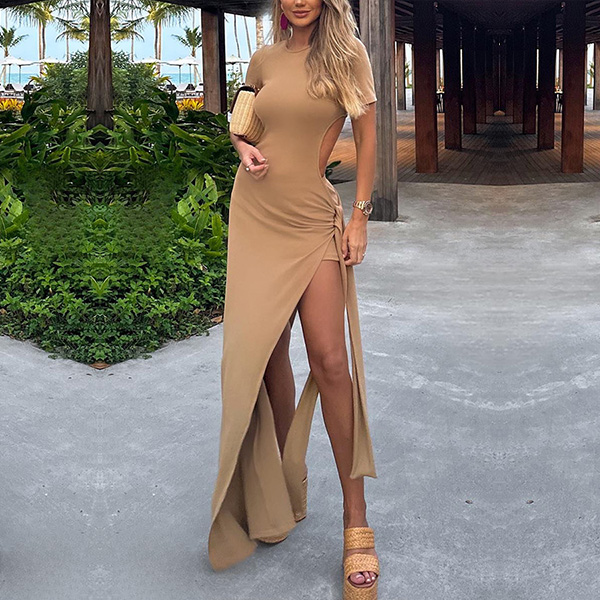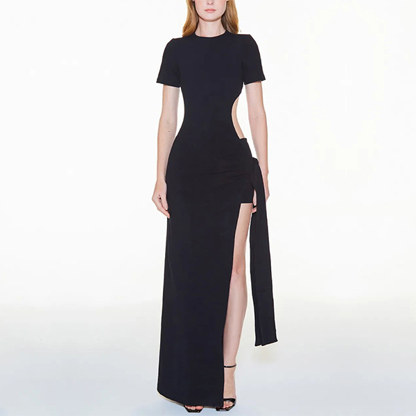 Sexy Round Neck Short Sleeve Side Cutout High-slit Self-tie Maxi Dress