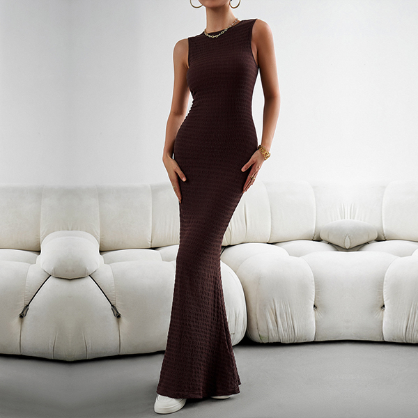 This maxi dress features a round neckline, sleeveless design, and a fishtail silhouette for a sexy and captivating look.