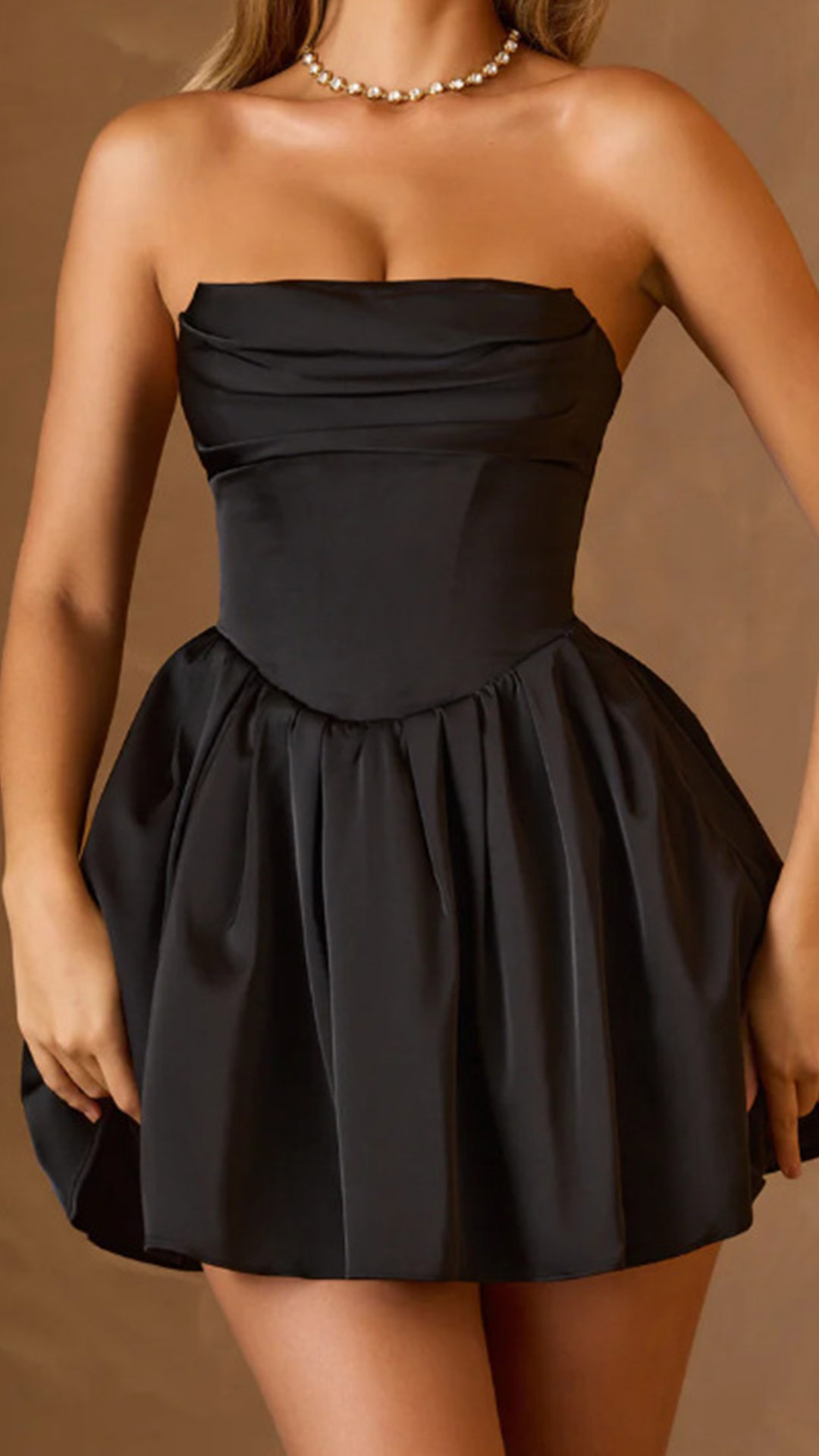 This dress features a flattering strapless neckline that showcases your shoulders and collarbones, adding a touch of allure and sophistication to the look. The ruched detailing along the bodice creates a figure-enhancing effect, accentuating your curves and creating a sleek and elegant silhouette.