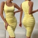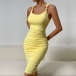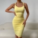 This yellow bodycon dress is a stunning piece that will turn heads. The body-hugging design is perfect for showing off your curves, while the ruched detailing adds a touch of elegance and texture to the dress. The bright yellow color is perfect for making a statement and standing out from the crowd. The dress is perfect for a night out, a party, or any special occasion where you want to look and feel confident and sexy. Pair it with your favorite heels and accessories to complete the look.