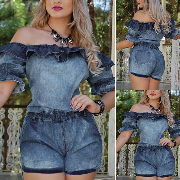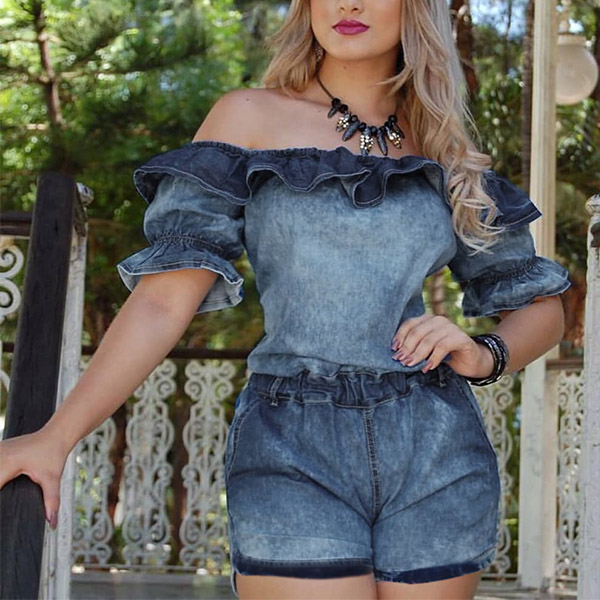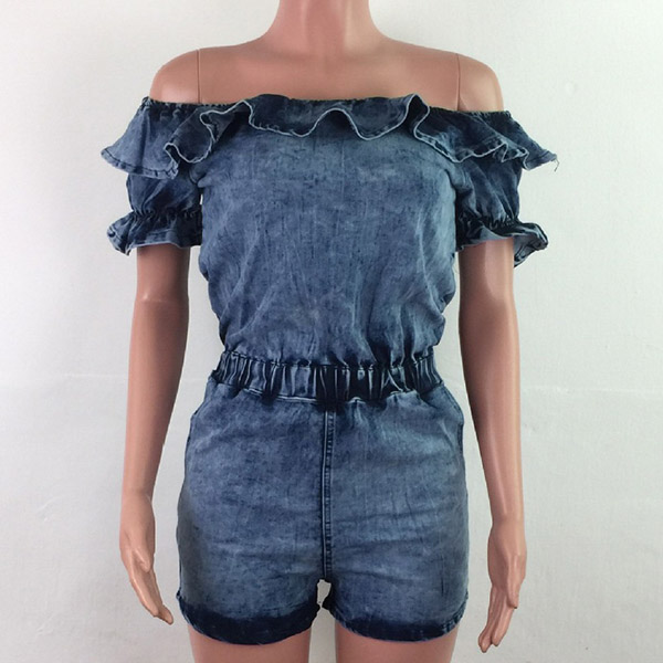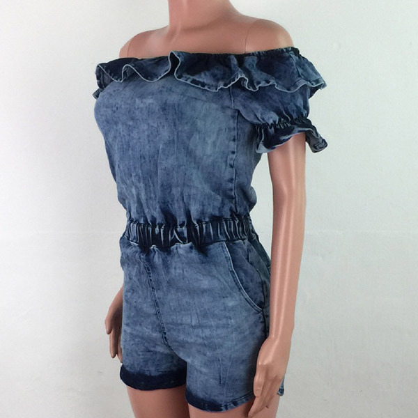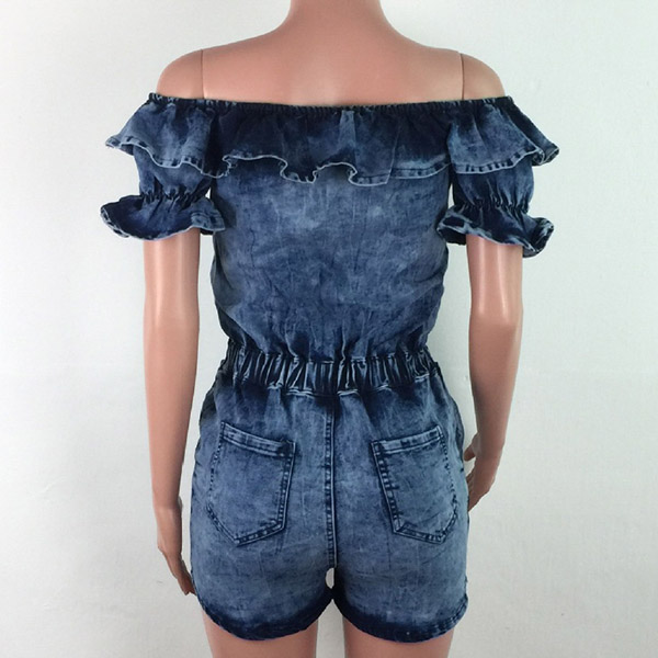 Sexy Ruffle Boat Neck Short Sleeve High Waist Denim Romper