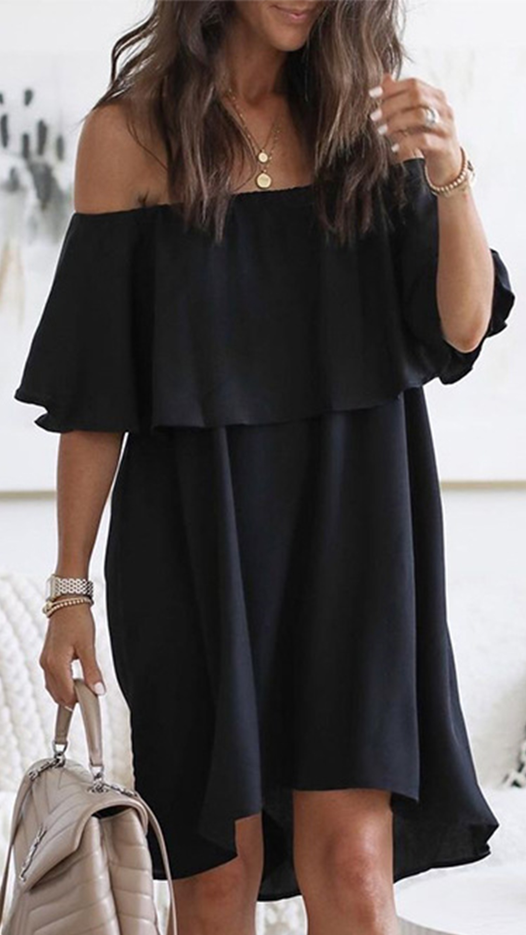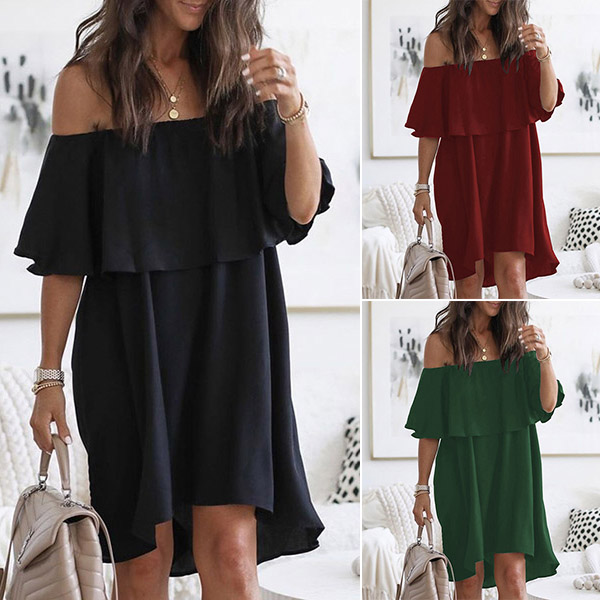 Wanna a sexy and flirty dating look? Then you can turn to this dress for help. Crafted in a solid color,the ruffle boat neck design will make you look alluring yet feminine. Finished with a loose silhouette,this dress can ensure you a comfortable day. You can consider adding a thin waistband if you wanna look more beautiful!
