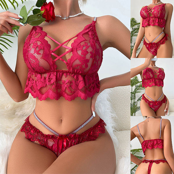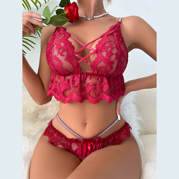 Sexy Ruffle Lace Cross-criss Bling-bling Two-piece Lingerie Set