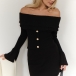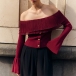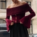 Get ready to turn heads in this Sexy Shirt. This stunning shirt features a flirty off-the-shoulder neckline with ruffle details. The trumpet sleeves create a romantic and feminine look, while the front button closure adds a classic touch. Pair it with jeans or a skirt for a chic and fashion-forward ensemble that will make you stand out.