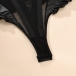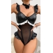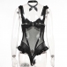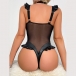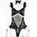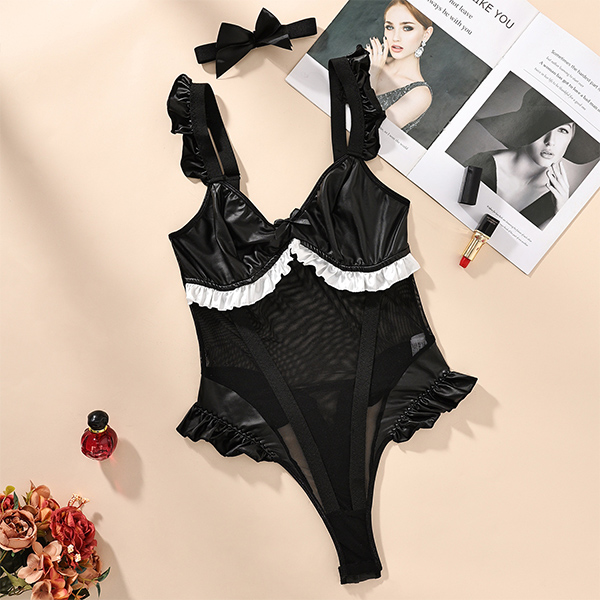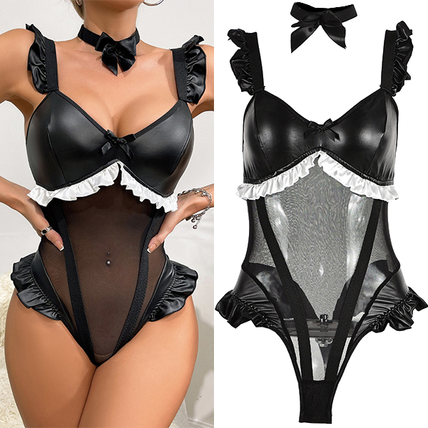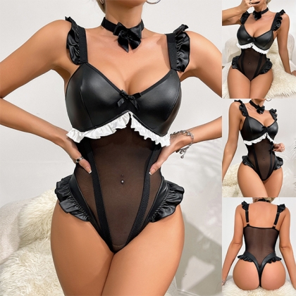 Sexy Ruffle Semi-through Gauze Spliced Artificial Leather PU Lingerie Bodysuit with Bowknot Choker