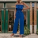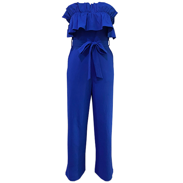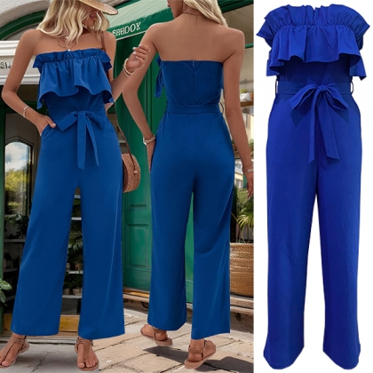 This captivating jumpsuit features a strapless silhouette with ruffle details, a self-tie waist detail, and a straight-cut leg, creating a visually striking and seductive ensemble that exudes effortless style and sophistication. Perfect for daily or formal wear.
