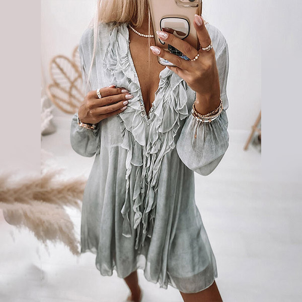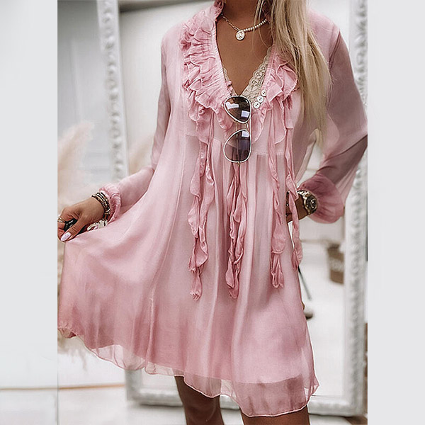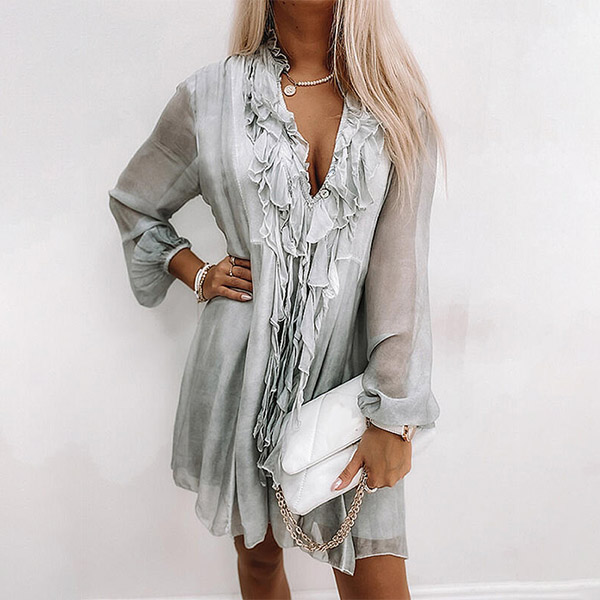 Sexy Ruffle Tassel V-neck Long Sleeve Solid Color Loose Chiffon Dress