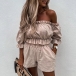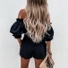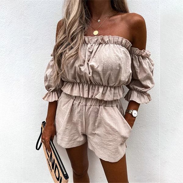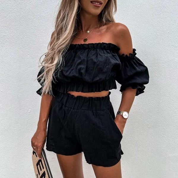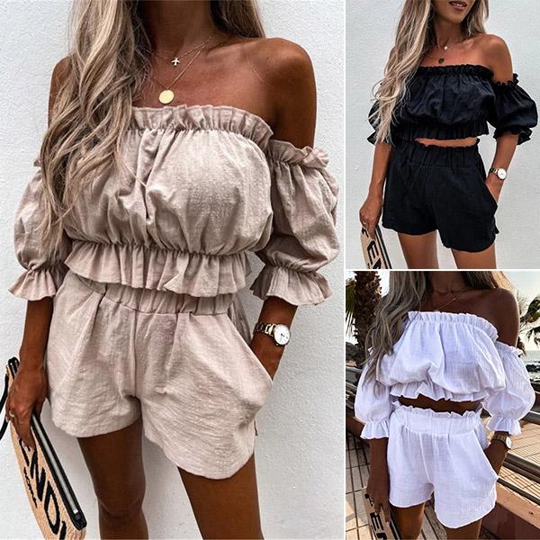 Sexy Ruffle Two-piece Set consist of Off-the-shoulder Crop Top and Shorts