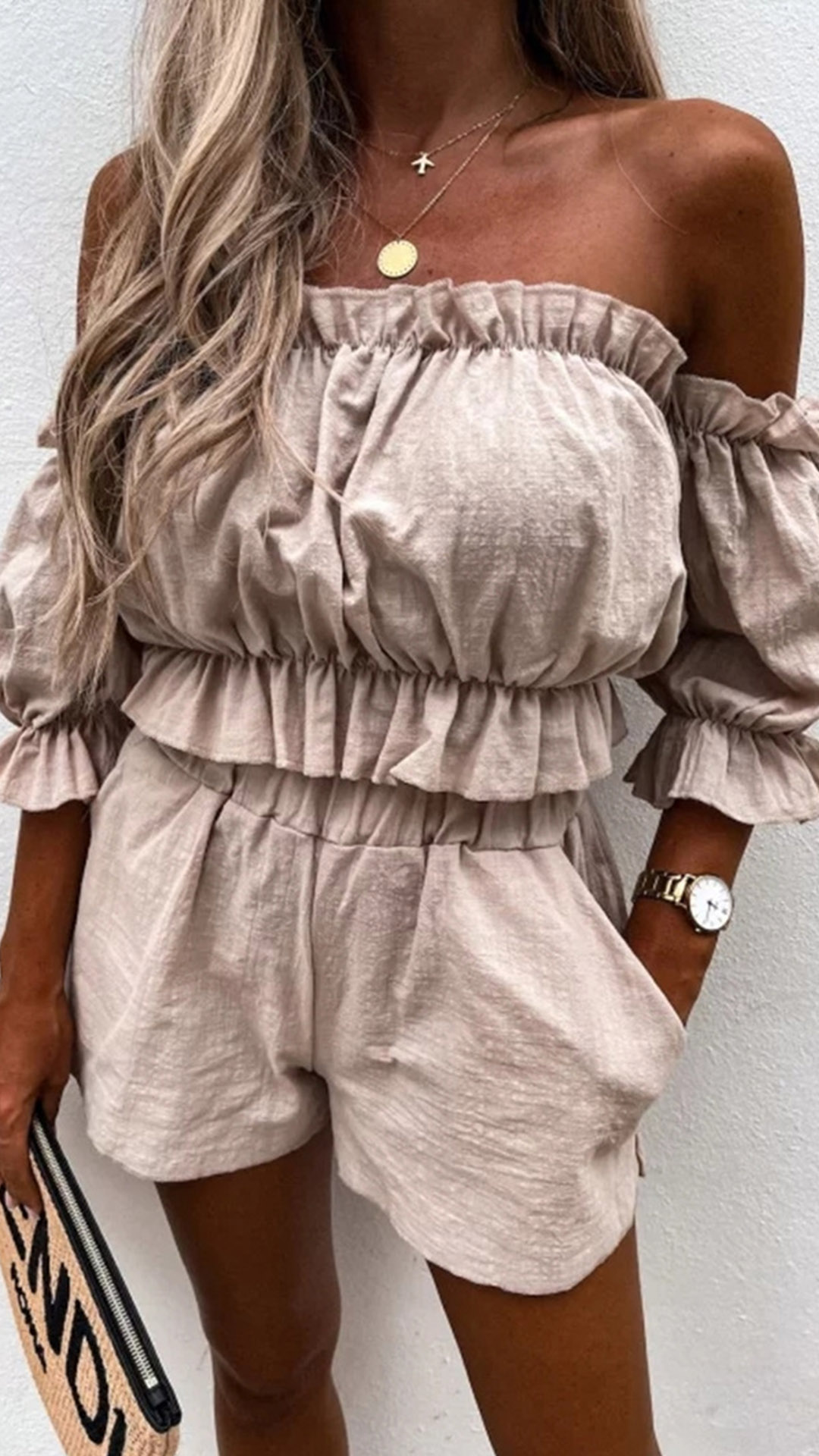 This Sexy Ruffle Two-piece Set is perfect for a day at the beach! The off-the-shoulder crop top is super flattering and the shorts are the perfect length. You'll love the way you look and feel in this set!