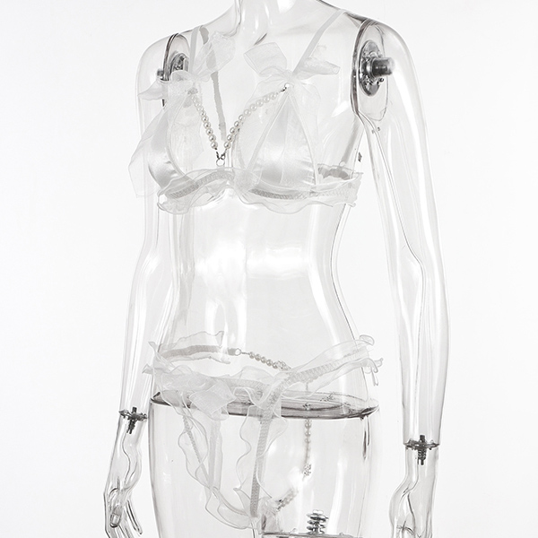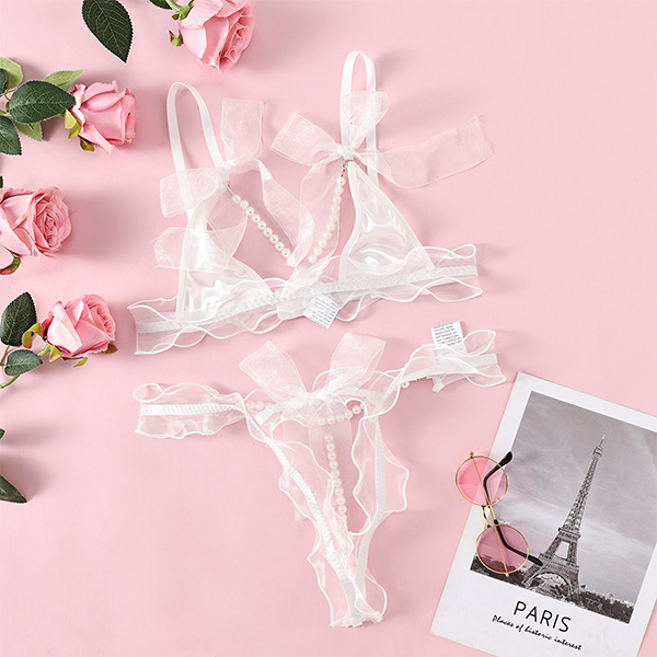Sexy Ruffled Bowknot Bead Chain Two-piece Lingerie Set