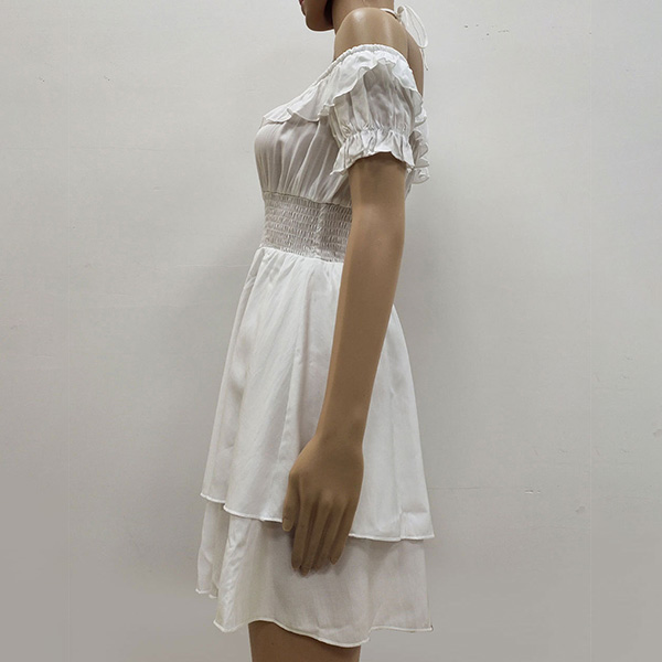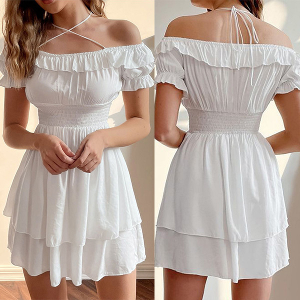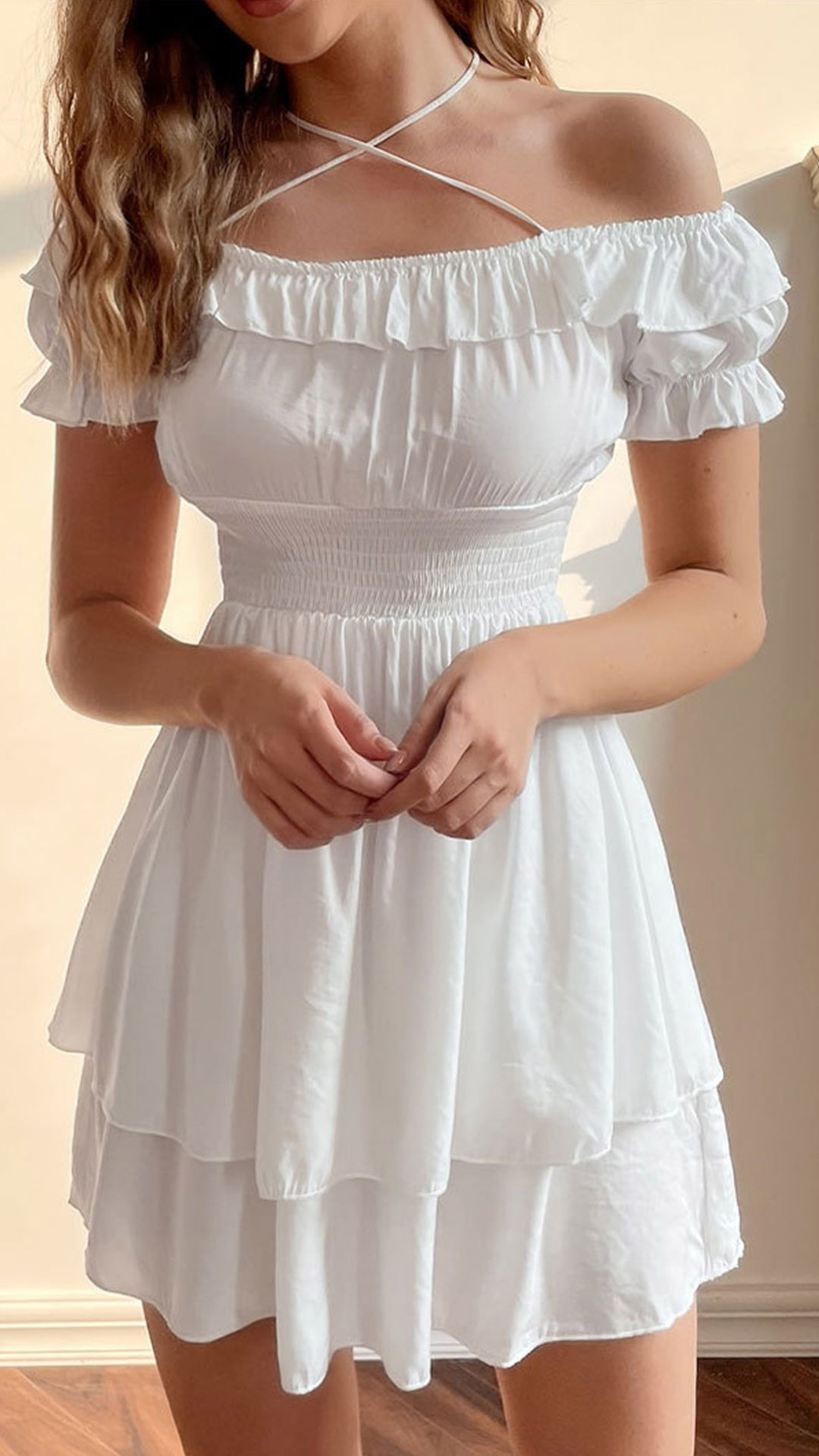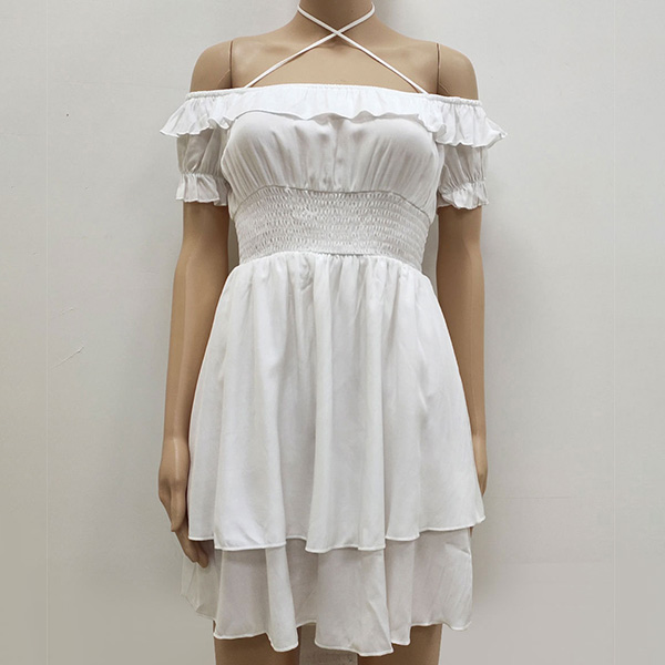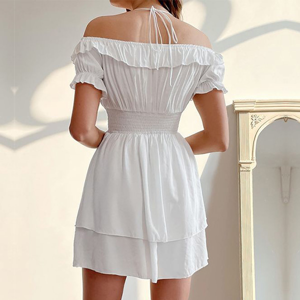 Sexy Ruffled Off-the-shoulder Smocked Halter White Dress